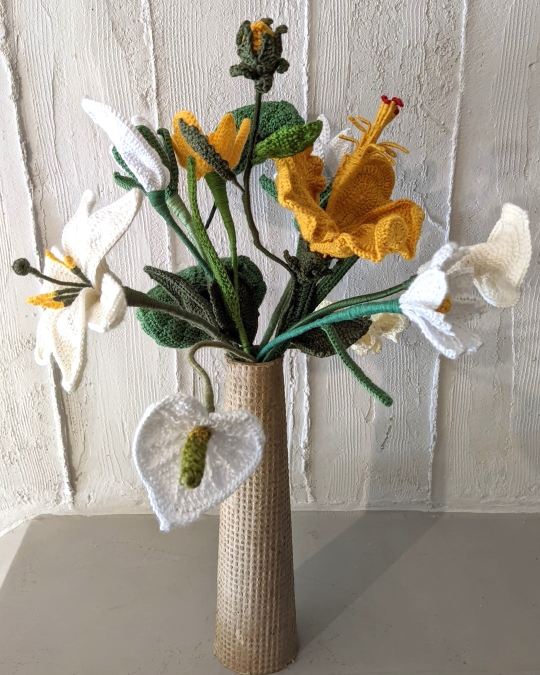 Κάθε λουλούδι απαιτεί ώρες προσεκτικής δουλειάς. Η επιλογή του κατάλληλου νήματος, των χρωμάτων και των υφών είναι απαραίτητη για να φαίνεται κάθε άνθος όσο το δυνατόν πιο ρεαλιστικό. Από κλειστά μπουμπούκια μέχρι πλήρως ανοιχτά λουλούδια, κάθε λεπτομέρεια πλέκεται με μεράκι.