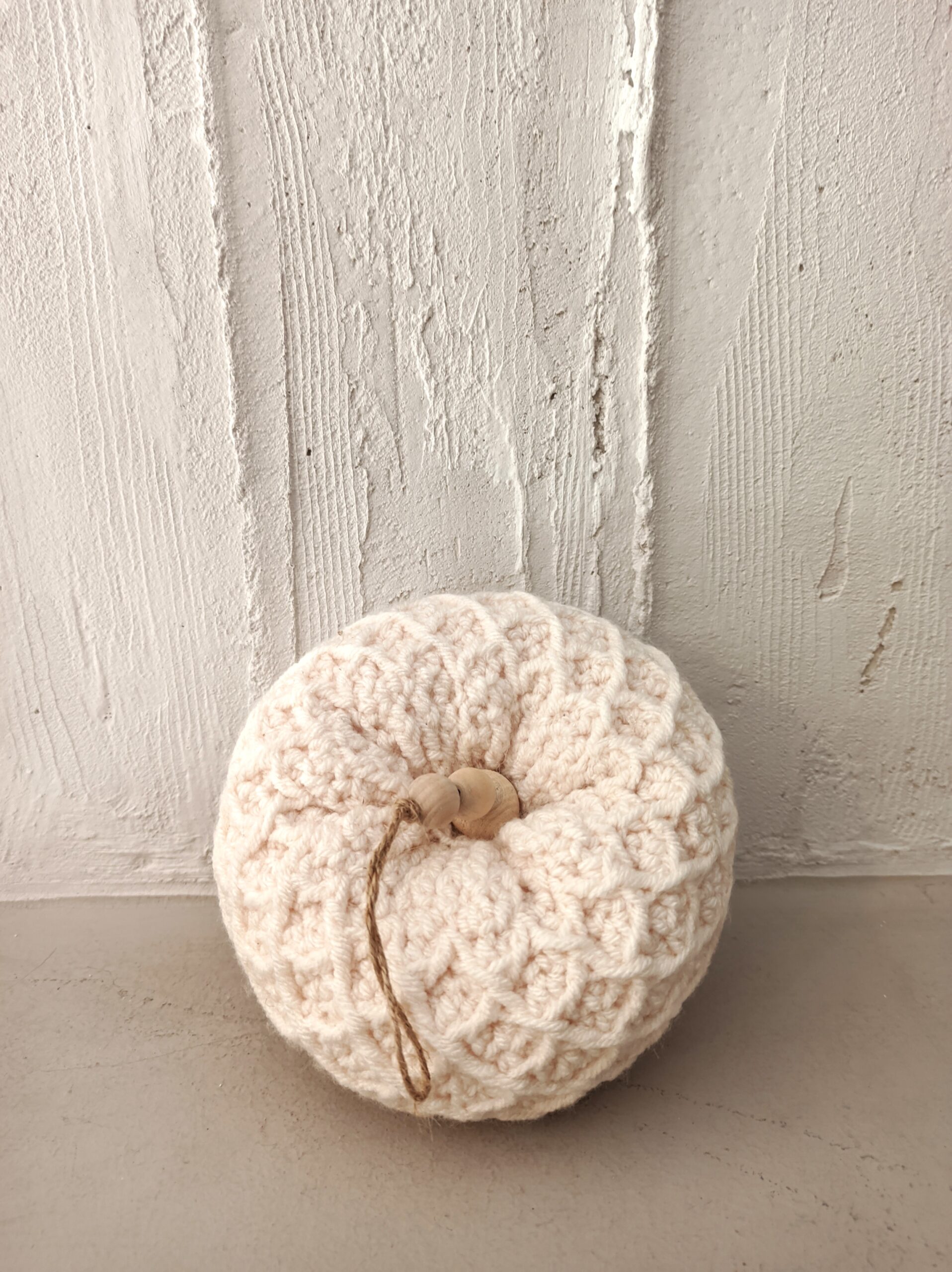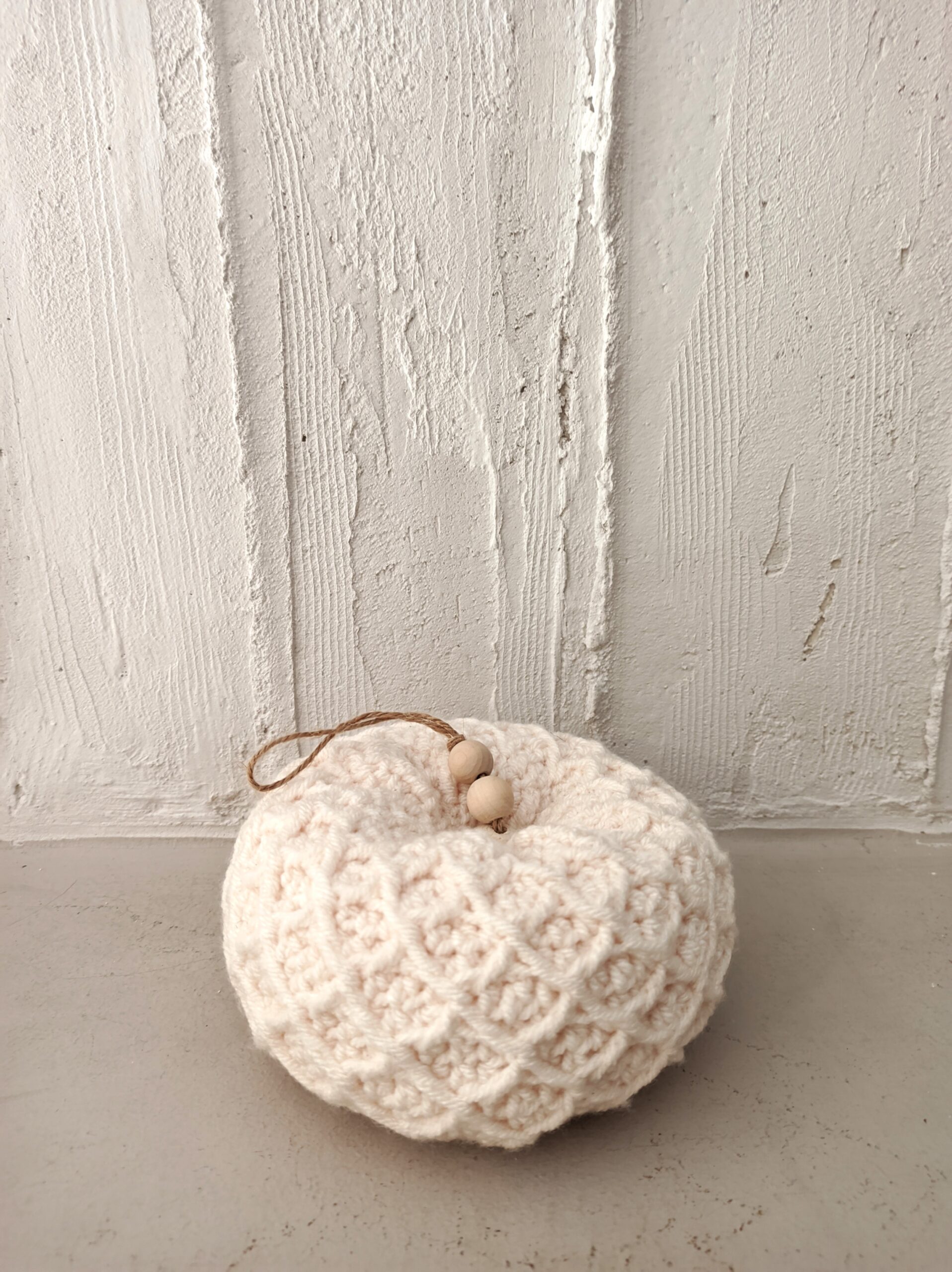 Crocheted decorative pumpkin made of acrylic yarn in minimal cream color. With a unique stitching and soft hypoallergenic filling. The composition is completed with a stem made of wooden beads, for a rustic feel.