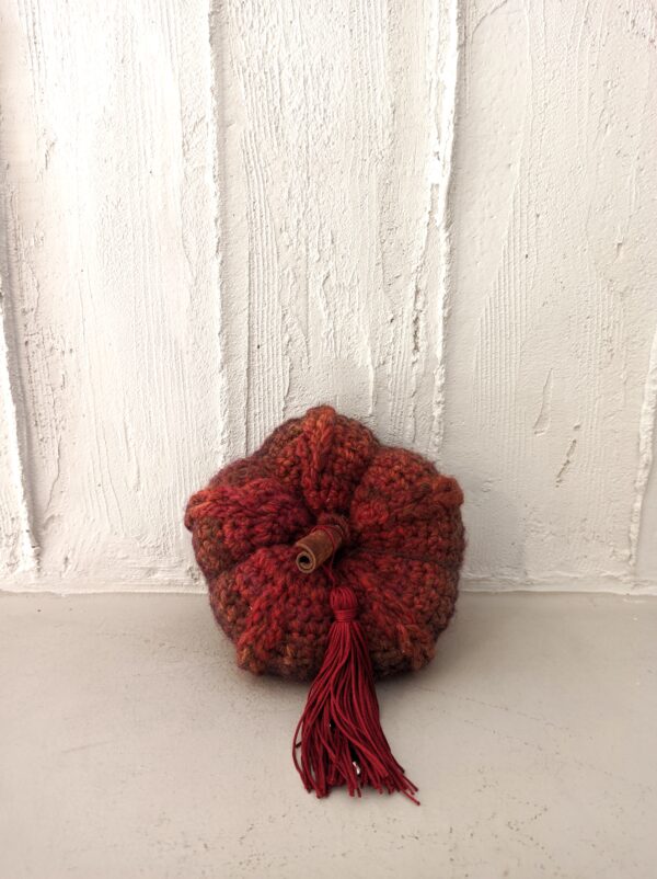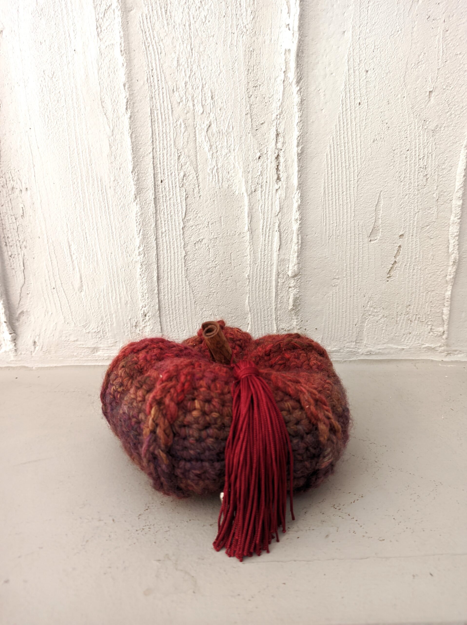 Πλεκτή, διακοσμητική κολοκύθα από ολόμαλλο νήμα, με αρωματικό ξύλο κανέλας και ιδιαίτερη πλέξη. Έχει διακοσμητική φούντα με κουδουνάκι, και μαλακό υποαλλεργικό γέμισμα. Ιδανική για να διακοσμήσει το χώρο σας αυτό το φθινόπωρο.