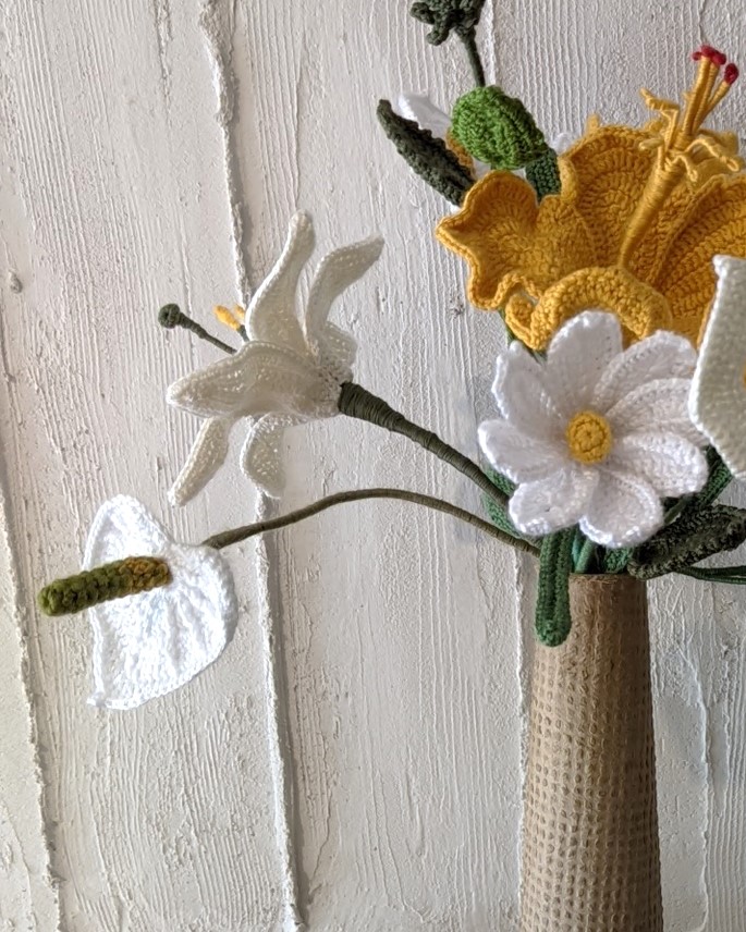 This elegant crocheted Anthurium brings style and freshness into your home. The flower features a white heart shaped bloom with a green-yellow spadix, creating a realistic and sleek arrangement. Approximately 35 cm tall, without leaves, it is a more economical and versatile choice for decorations or bouquets.