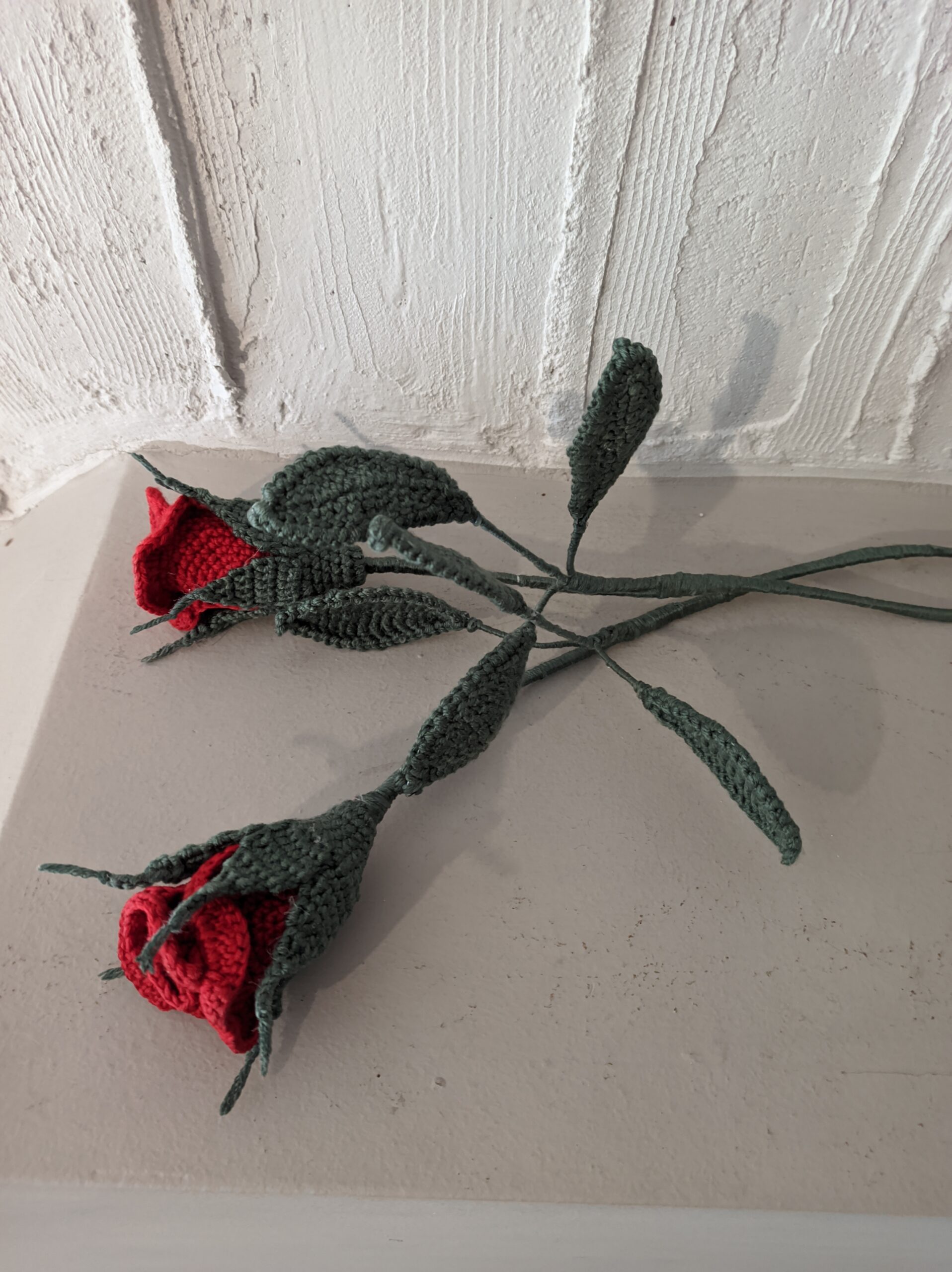 This delicate crocheted red rose captures the timeless beauty of nature in a lasting handmade piece. Carefully crafted with soft, high-quality yarn, it features a partially closed bloom – not quite a bud, not fully open – giving it a graceful, natural look. The rose stands tall at approximately 35 cm, complete with rich green leaves and a sturdy stem.