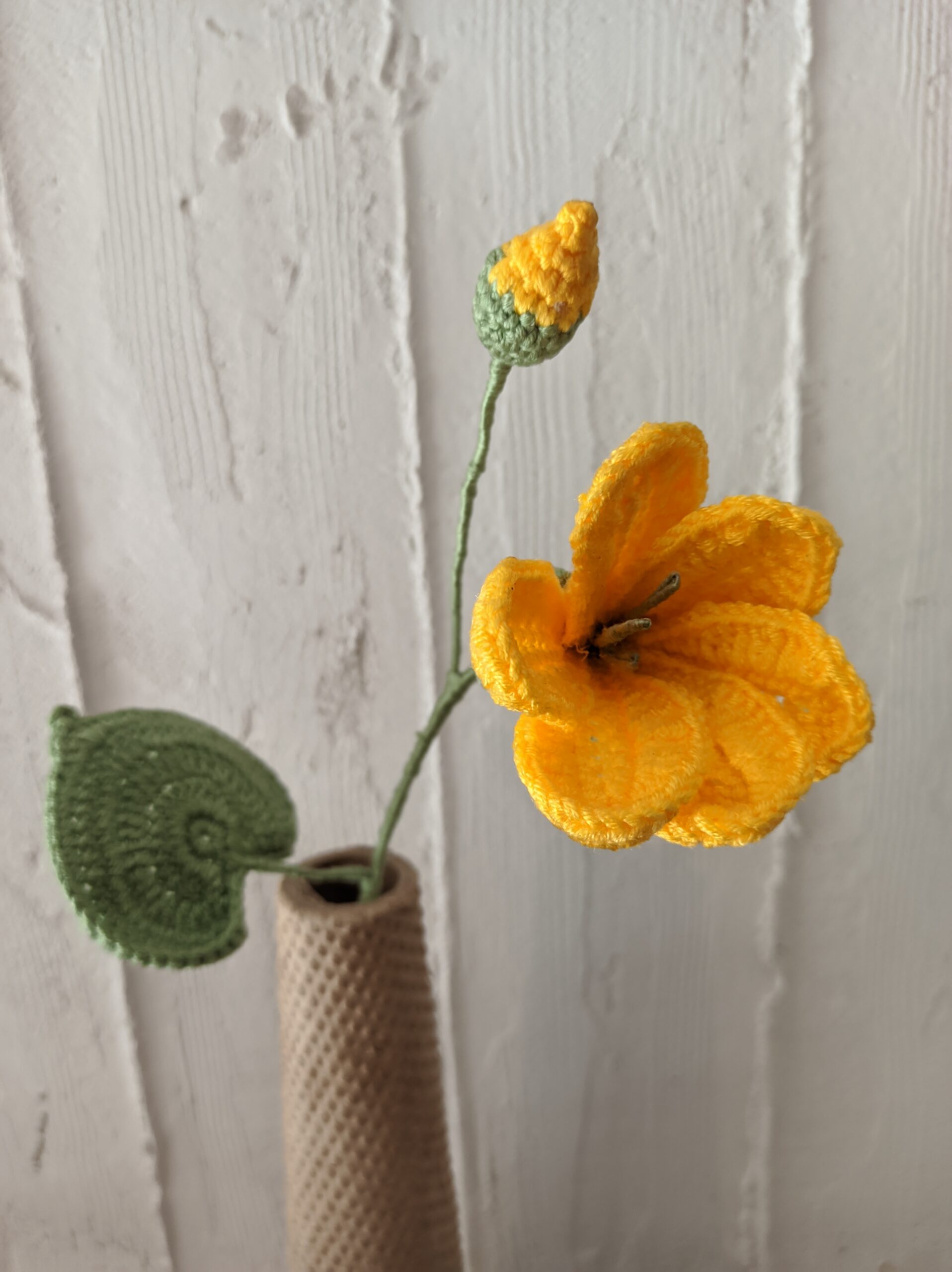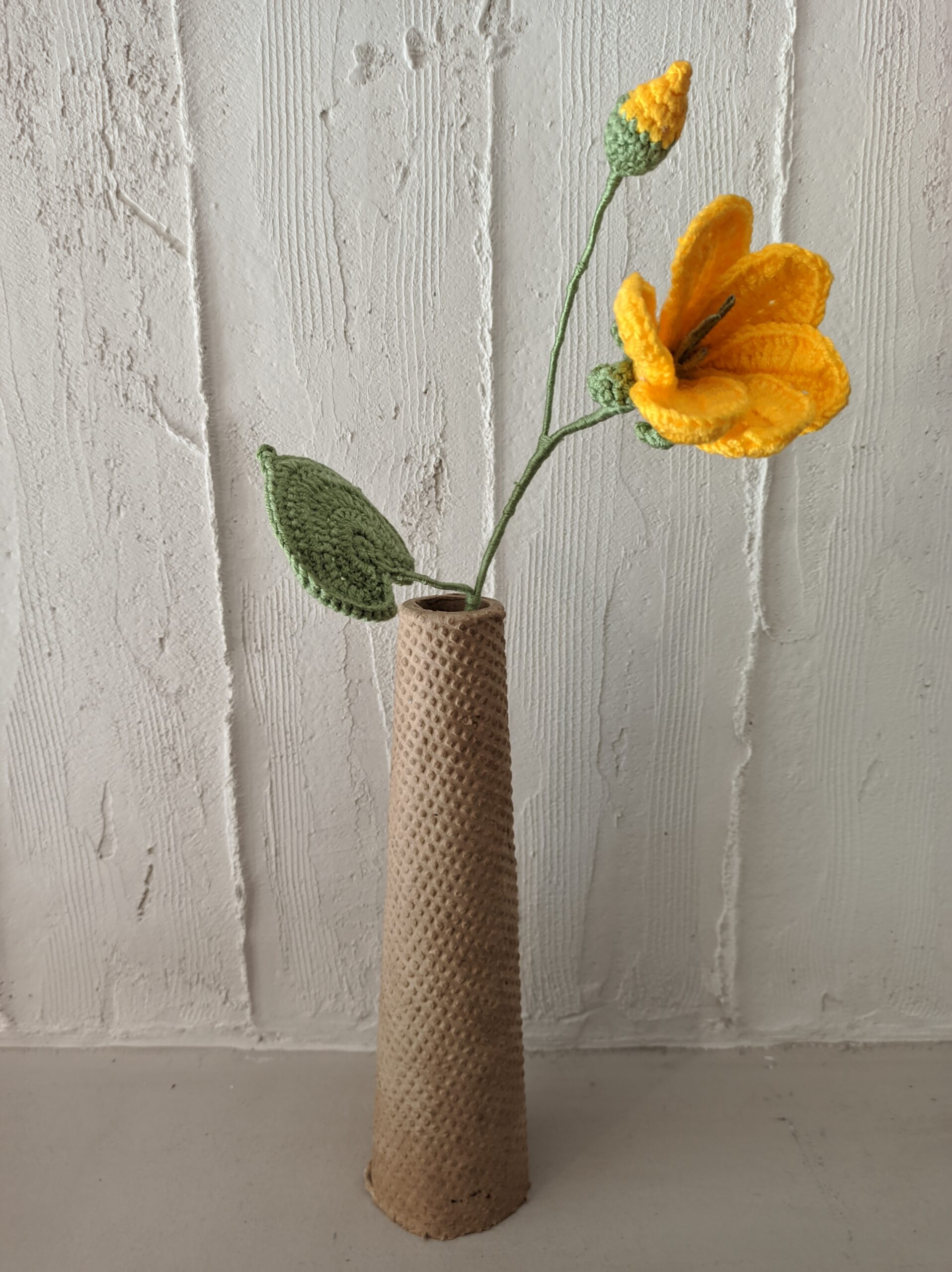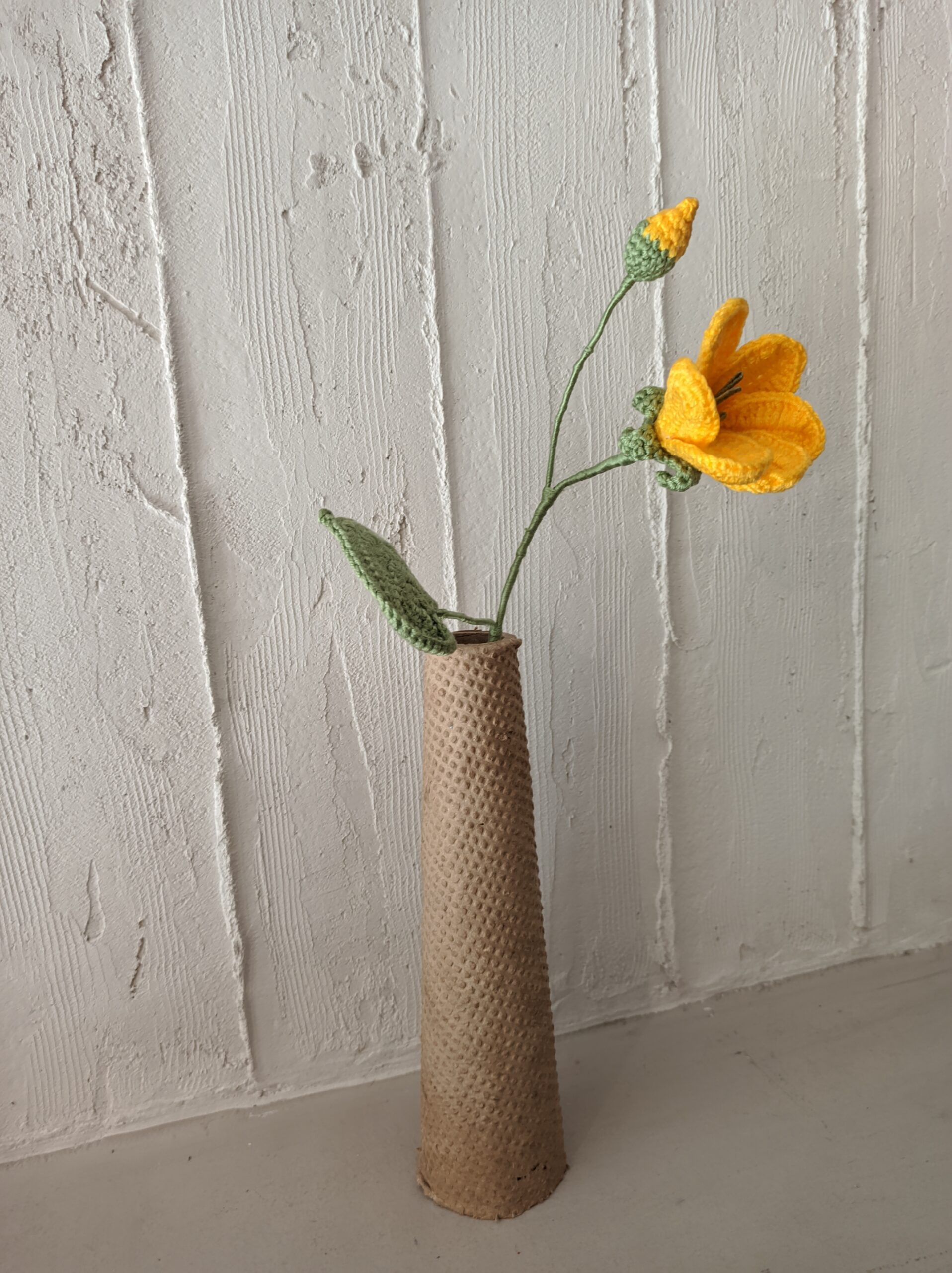 Αυτό το πλεκτό λουλούδι φέρνει ζωντάνια και χρώμα στον χώρο σας. Με άνθος σε έντονο κίτρινο χρώμα, μπουμπούκι και φύλλα. Ιδανικό για ανθοδέσμες ή διακοσμητικές συνθέσεις.
