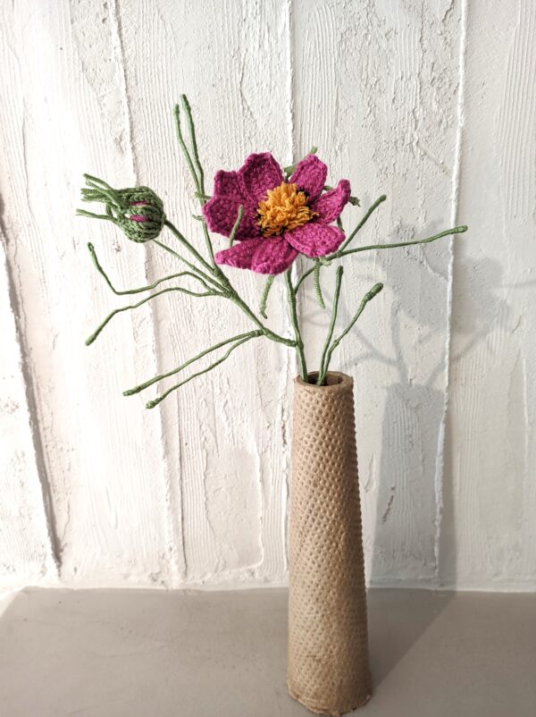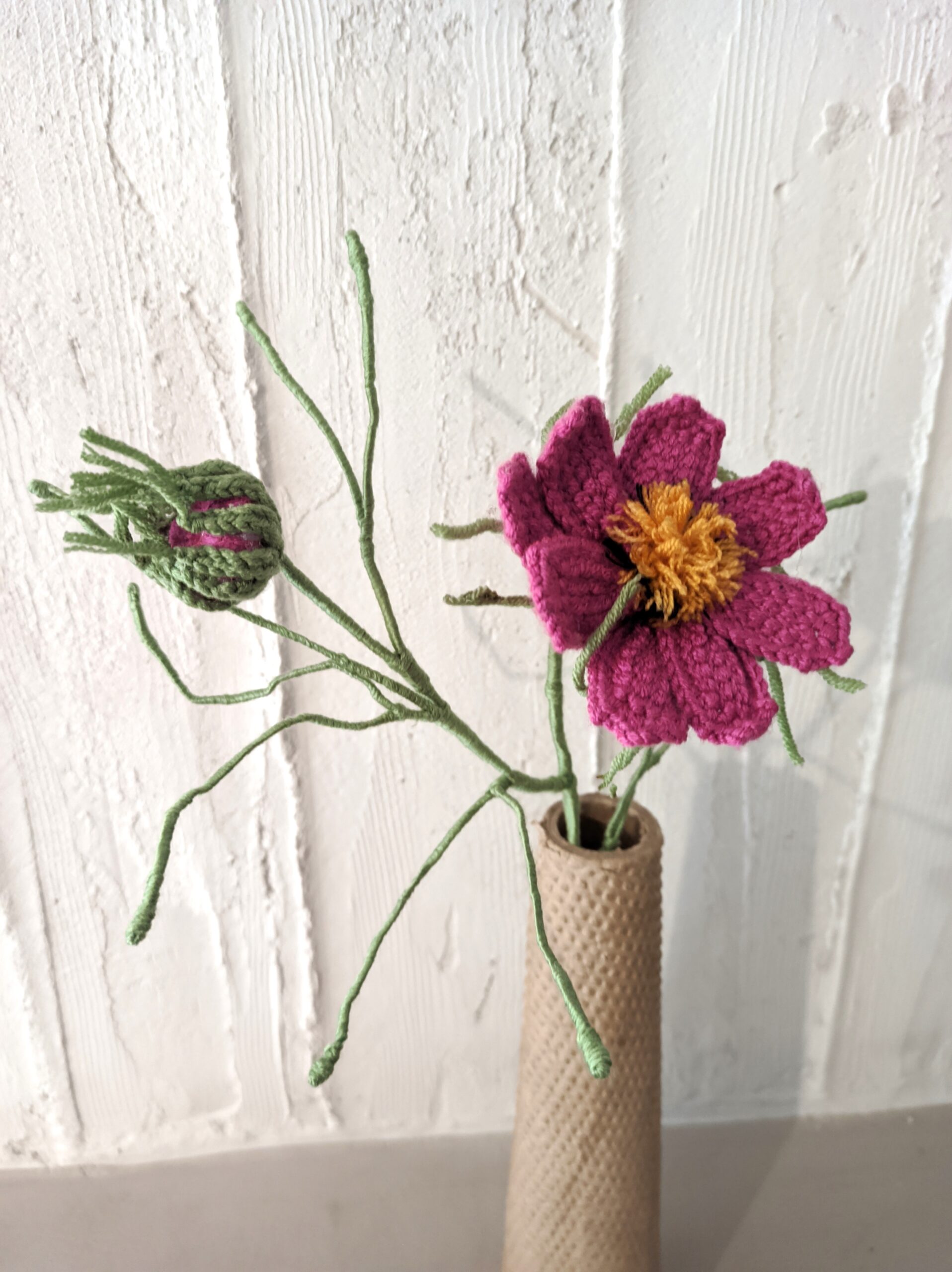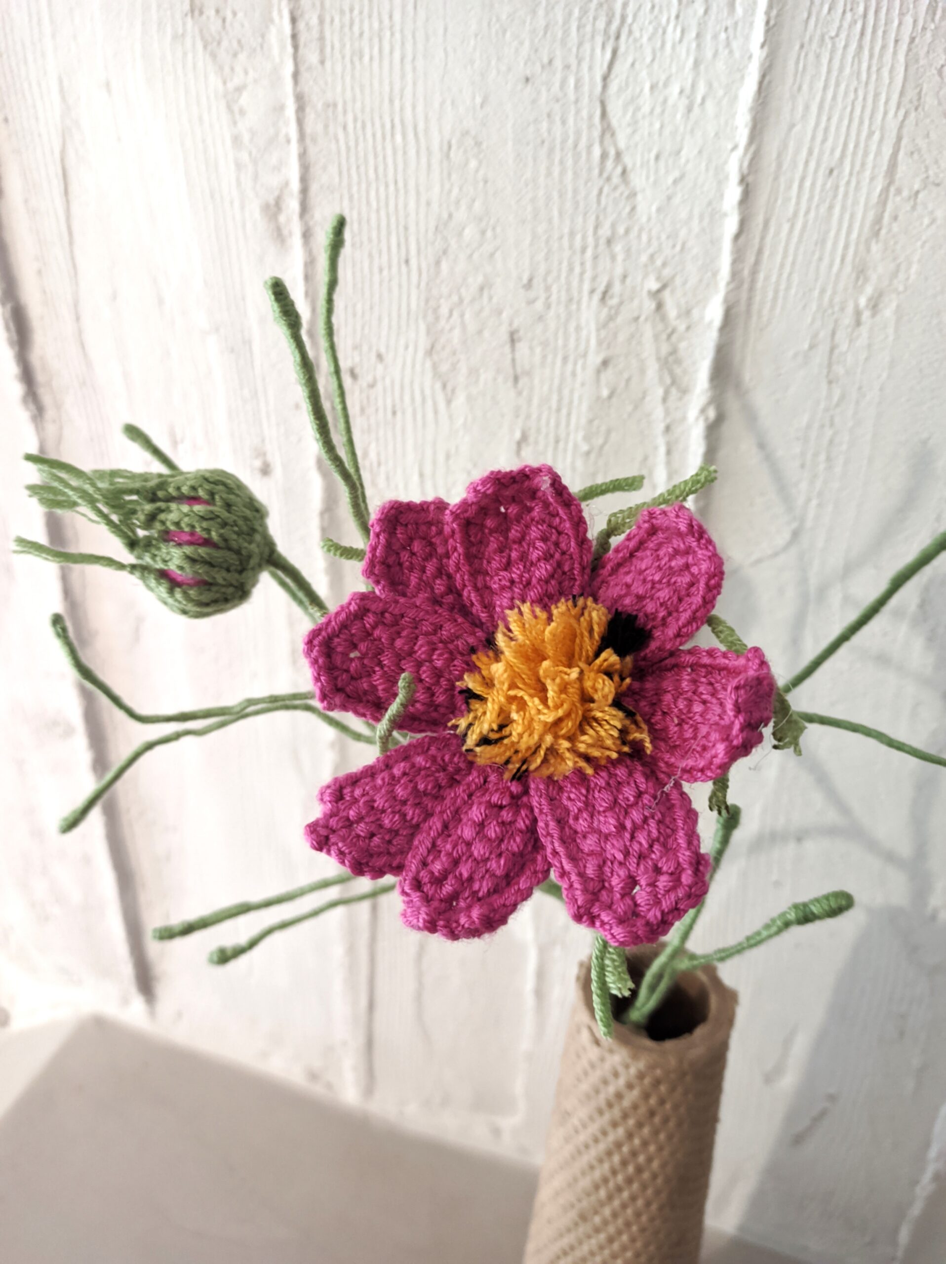 A handmade crochet Cosmos flower in vivid fuchsia tones — bright, joyful, and full of life. This realistic piece features one open bloom and a closed bud, complemented by fine, airy leaves that add a natural, delicate texture. Every detail is carefully crafted to capture the effortless charm of the real flower.