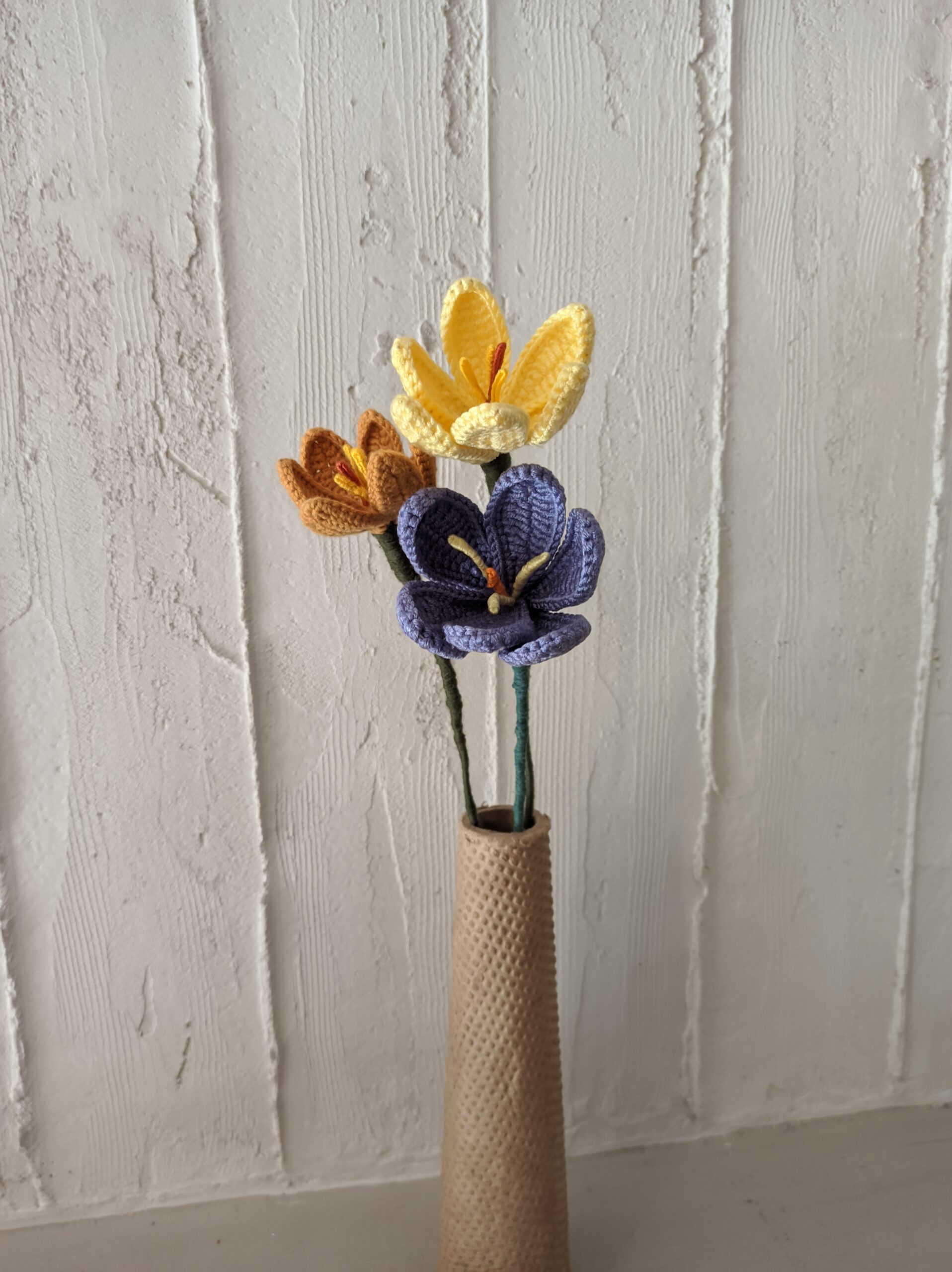 This charming crocheted crocus brings the freshness and color of spring into your home. Available in purple, mustard, and yellow, it stands at approximately 35 cm with a soft, flexible stem. Each flower is handmade, unique, and radiates a sense of joy and cheerfulness.