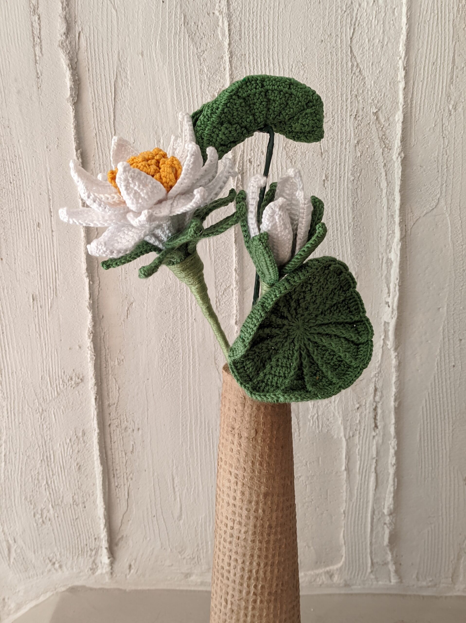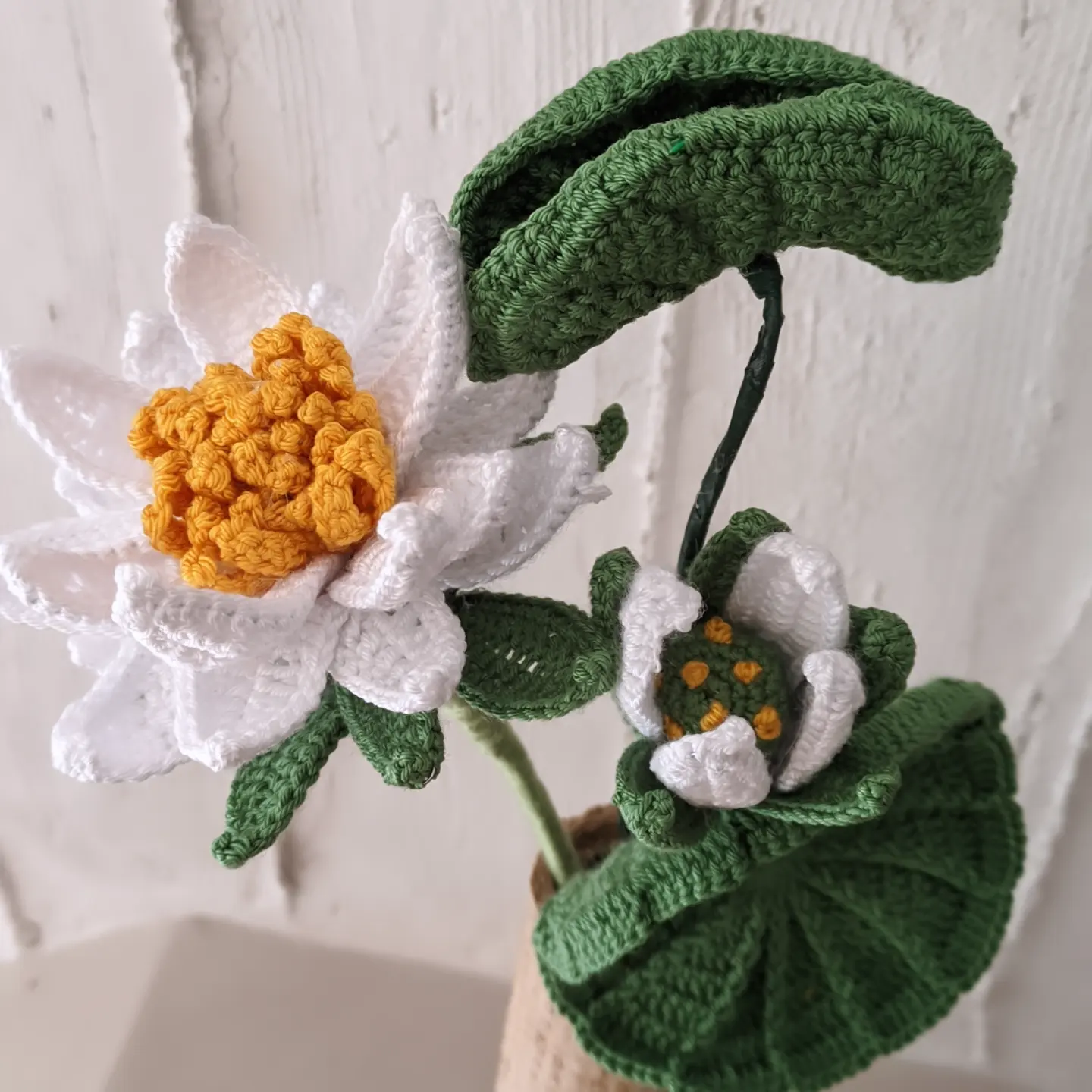 This crocheted Lotus brings serenity and elegance into your home. The flower is white with a half-opened bud and is accompanied by its characteristic round leaves, creating a realistic and symmetrical arrangement. Measuring approximately 35-40 cm, this handmade flower is perfect for any bouquet or decoration.