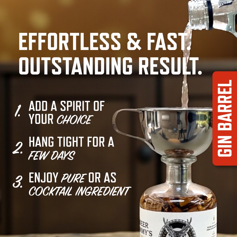 Ρίξτε βότκα, τζιν, τεκίλα, λευκό κονιάκ ή γράπα στο γυάλινο μπουκάλι premium που περιέχει αυθεντικά κομμάτια δρύινου βαρελιού Speyside. Μέσα σε λίγες εβδομάδες, τα βαθιά αρώματα του ώριμου ξύλου, της απαλής βανίλιας και των λεπτών μπαχαρικών αρχίζουν να μεταμορφώνουν το βασικό σας ποτό, προσδίδοντάς του έναν σύνθετο, έντονο χαρακτήρα παλαίωσης σε βαρέλι.
