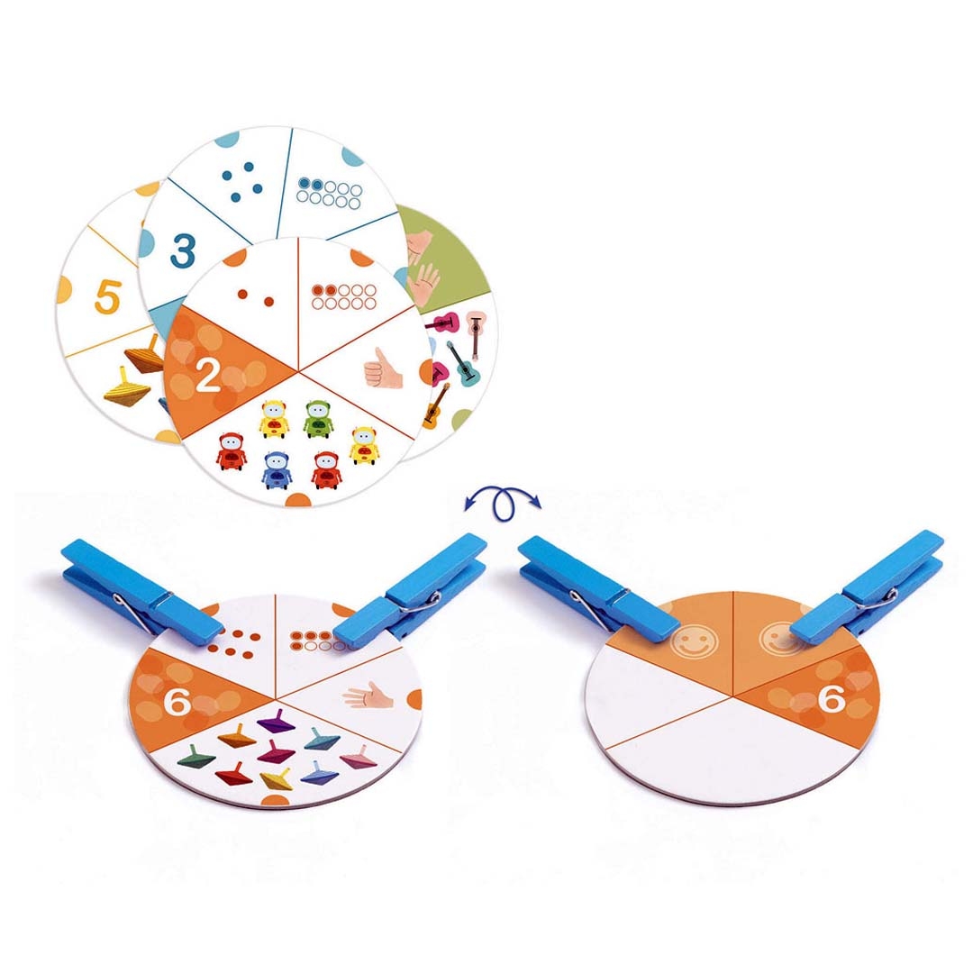 Οι μικροί μας φίλοι επιλέγουν δύο απεικονίσεις, που αντιστοιχούν στον αριθμό της κάρτας, τοποθετώντας δύο μανταλάκια. Μάλιστα, υπάρχει τρόπος να τσεκάρουν αν έκαναν τη σωστή ή τη λάθος επιλογή, γυρνώντας απλώς την κάρτα και βλέποντας τη λύση στην πίσω πλευρά.