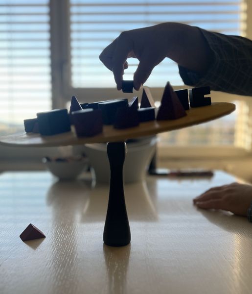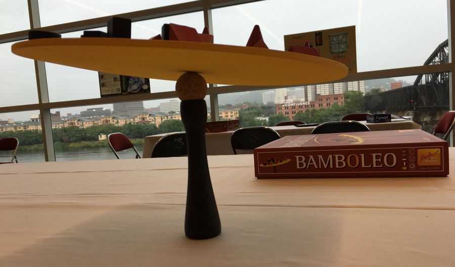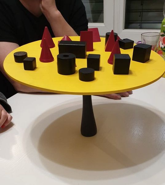Μια ποικιλία από ξύλινα κομμάτια περίεργου σχήματος τοποθετούνται σε ένα στρογγυλό ξύλινο «πιάτο». Το “πιάτο” έχει μια μπάλα από φελλό στο κάτω μέρος της, η οποία στη συνέχεια τοποθετείται πάνω σε μια κωνική βάση. Το κόλπο είναι ότι τα κομμάτια με το περίεργο σχήμα πρέπει να αφαιρεθούν ένα προς ένα, κάτι που έχει μεγάλη πιθανότητα να διαταράξει την ευαίσθητη ισορροπία ολόκληρου του μηχανισμού. Όσο μεγαλύτερο είναι το κομμάτι που αφαιρείτε όταν έρχεται η σειρά σας, τόσο περισσότερους πόντους κερδίζετε, αλλά έχετε μεγαλύτερη πιθανότητα να τα ρίξετε όλα κάτω, κάτι που σας δίνει αρνητικούς πόντους.