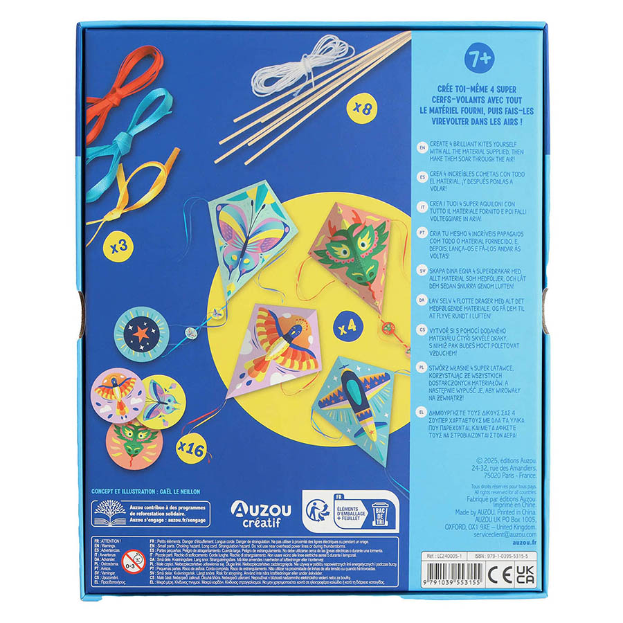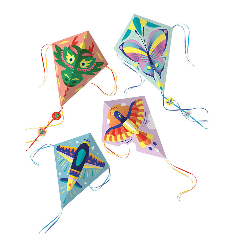 Στη συσκευασία περιλαμβάνονται: 4 σχέδια χαρταετών, 8 ξυλάκια, 3 χρωματιστές κορδέλες, σχοινί και διακοσμητικά αυτοκόλλητα.