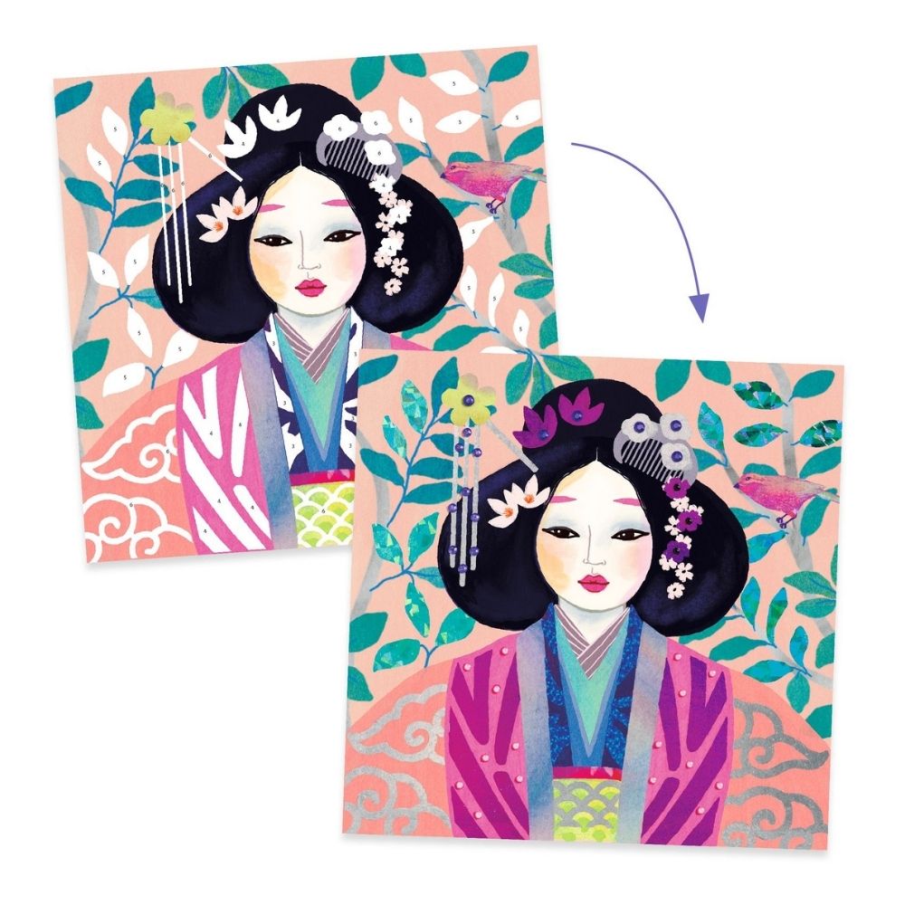 Ακολουθήστε τις οδηγίες βήμα – βήμα και διακοσμήστε 4 εικόνες με χρωματιστά μεταλλικά φύλλα και αυτοκόλλητα πετράδια! Οι εικόνες ξεχωρίζουν χάρη στην ιδιαίτερη εικονογράφηση της εταιρίας Djeco και αναπαριστούν 4 κορίτσια με παραδοσιακές στολές διαφορετικών εθνικοτήτων! Το μεταλλικό εφέ και τα τρισδιάστατα πετράδια προσδίδουν ένα εντυπωσιακό τελικό αποτέλεσμα που μπορεί να αποτελέσει ιδανική επιλογή για το στολισμό του παιδικού δωματίου.