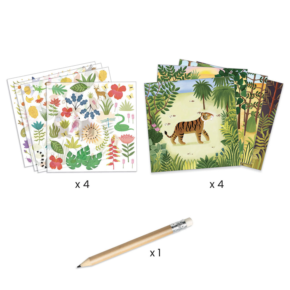 Εμπνευσμένος από το έργο του Henri (Le Douanier) Rousseau, ο εικονογράφος Bex Parkins μας προσφέρει τοπία σε στυλ Naive Art για να δημιουργήσουμε, τοποθετώντας στοιχεία με τη μέθοδο της χαλκομανίας. Πρόκειται για την ερμηνεία του έργου του μεγάλου Ανρί Ρουσσώ, από ένα σύγχρονο εικονογράφο.