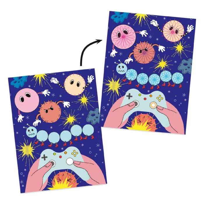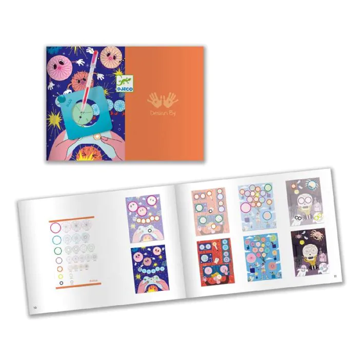Διακοσμήστε καθεμία από τις 30 εικονογραφημένες σελίδες με σπείρες. Οι βάσεις για τους τροχούς δημιουργίας σπειρών στερεώνονται μαγνητικά στον μεταλλικό πίνακα, επιτρέποντάς σας να σχεδιάζετε τις σπείρες χωρίς οι τροχοί να μετακινούνται. Έτσι, έχετε απόλυτη ελευθερία να σχεδιάσετε και να διακοσμήσετε τις εικόνες του φόντου όπως εσείς επιλέξετε.