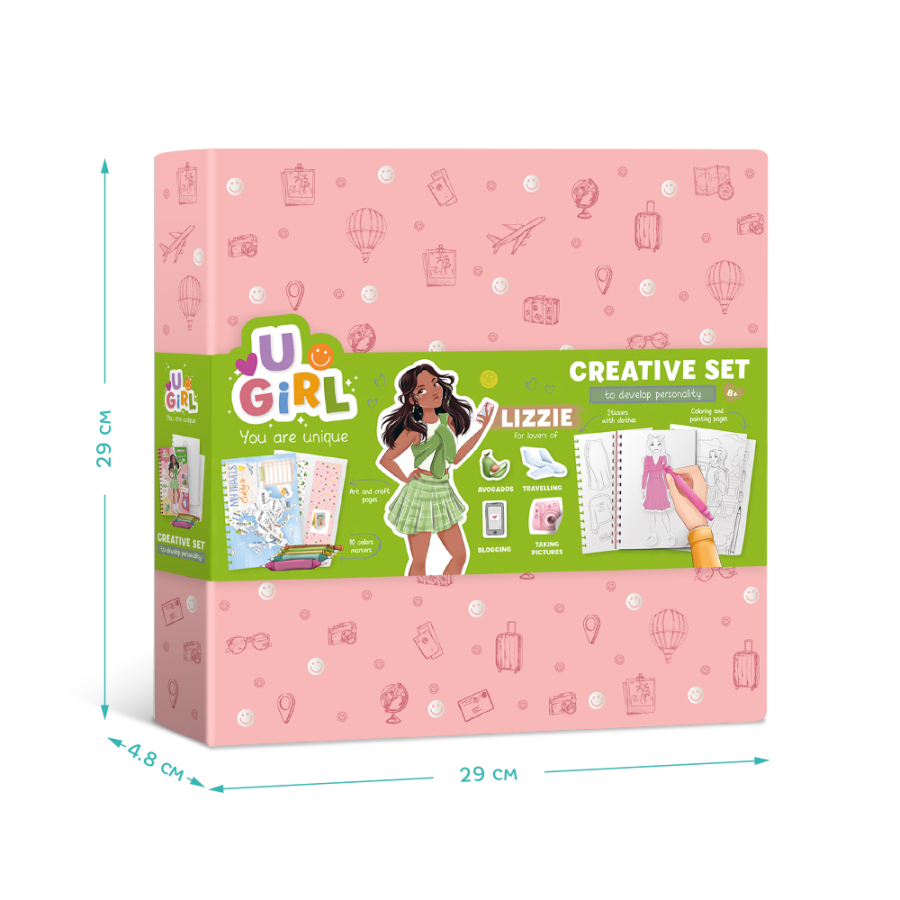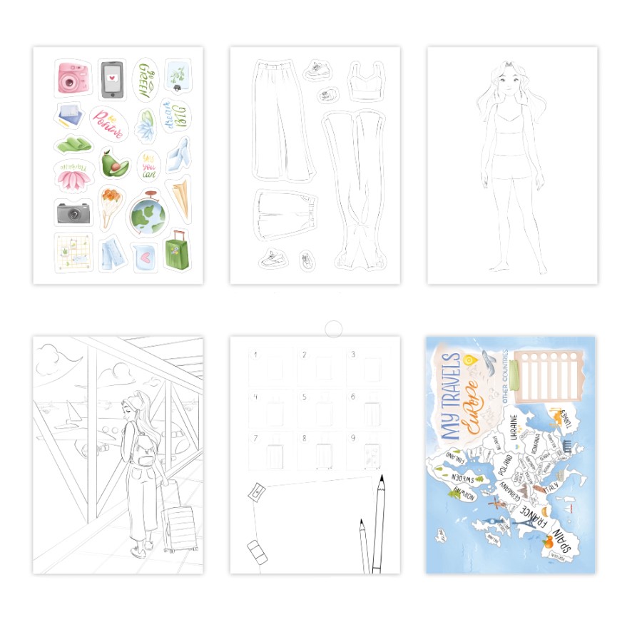 Περιεχόμενα: μπλοκ με εικόνες ( 25 x 17,6 cm ), 10 μαρκαδόροι, αυτοκόλλητα και 6 σελίδες χρωματισμού με αυτοκόλλητα, 15 φιγούρες κοριτσιών για τη δημιουργία εικόνων, 4 σελίδες χρωματισμού, 3 σελίδες με σχέδιο βήμα προς βήμα, 4 σελίδες με χειροτεχνίες.